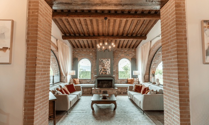 The house itself exudes rustic charm, blending traditional architecture with understated luxury. Think exposed beams, warm terracotta tones and elegant yet comfortable living spaces that open out onto panoramic terraces. You can read more about its interior design and the inspiration behind it, here.