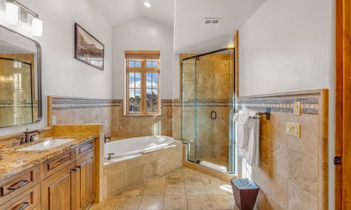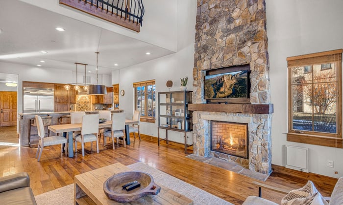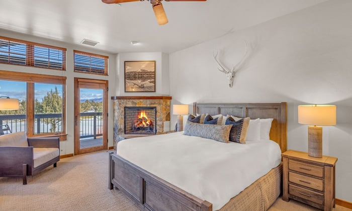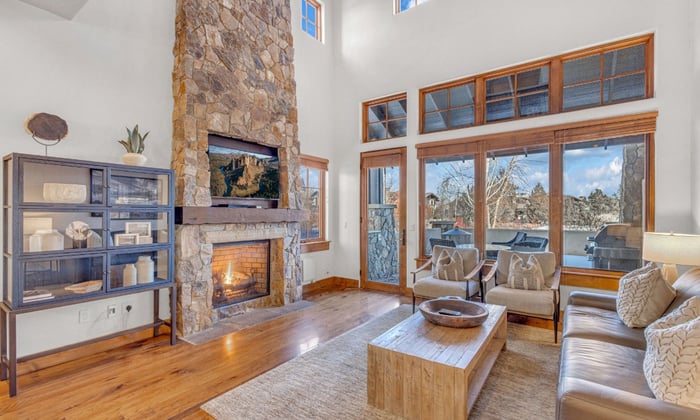 - Natural stone fireplaces in living room and master suite