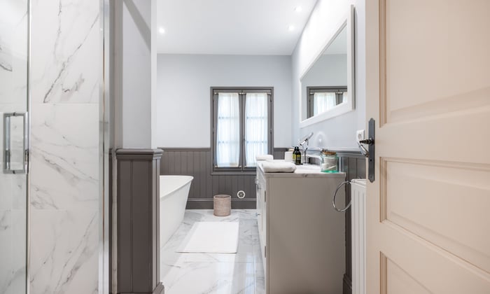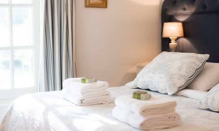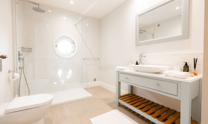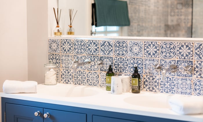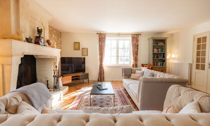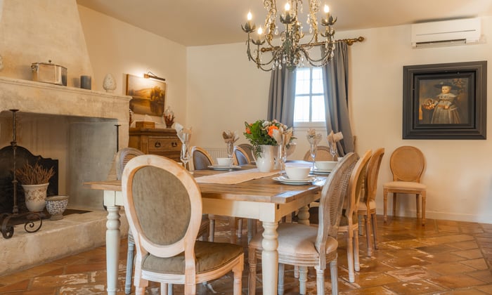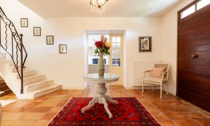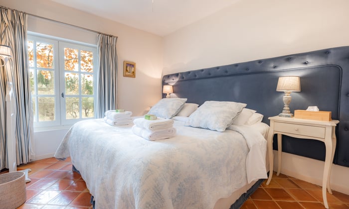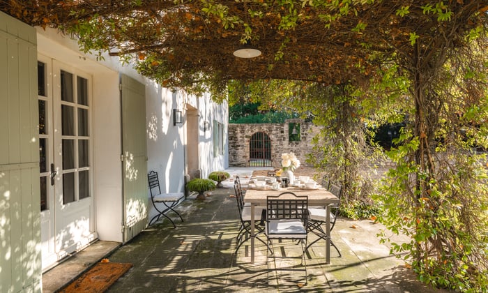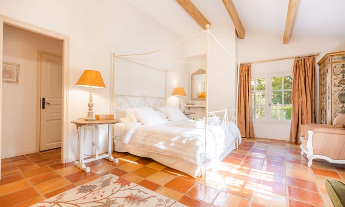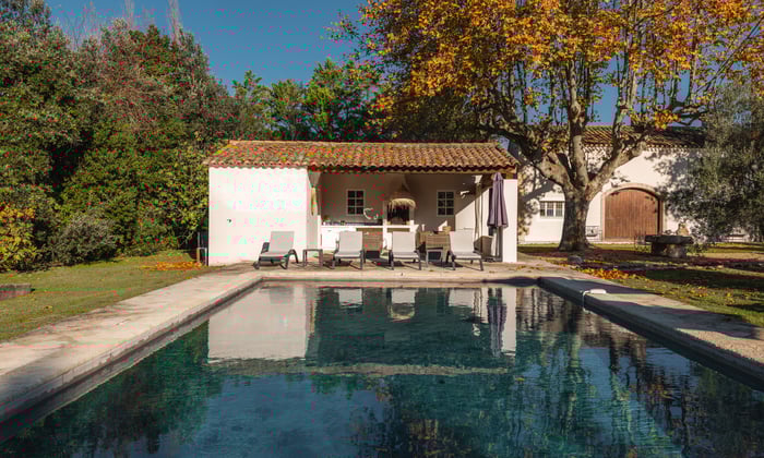 Light and airy, the Provençal farmhouse has an impossing façade, light blue shutters and a wisteria-covered pergola for al fresco dining. To the left is a stylish swimming pool attached to its own pool house. The grounds are pristine, perfect for a game of boules under the shade.