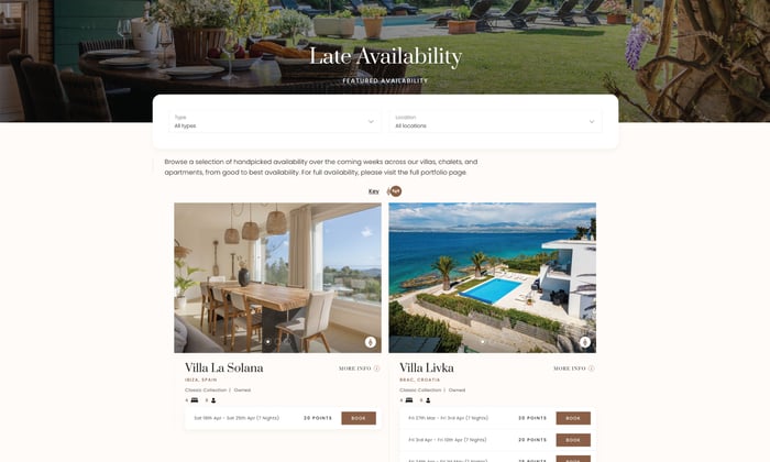 Inside the member portal, our Late Availability page highlights handpicked upcoming stays across the portfolio, from good to best availability over the coming weeks. We also send a fortnightly 'Featured Availability' email to Members to highlight options.