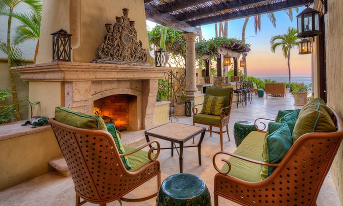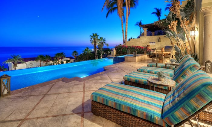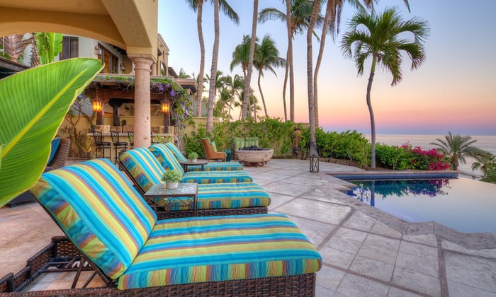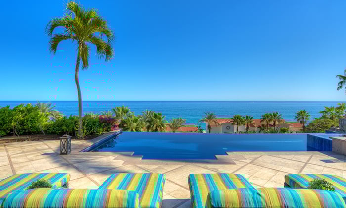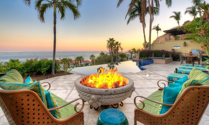 Here you'll find an infinity edge pool and spa, set against the backdrop of blue sky and turquoise water, alongside an outdoor covered dining space, a covered patio with fireplace, a stone-topped bar, and a lounge area that's perfectly positioned for views of amazing sunrises and sunsets.