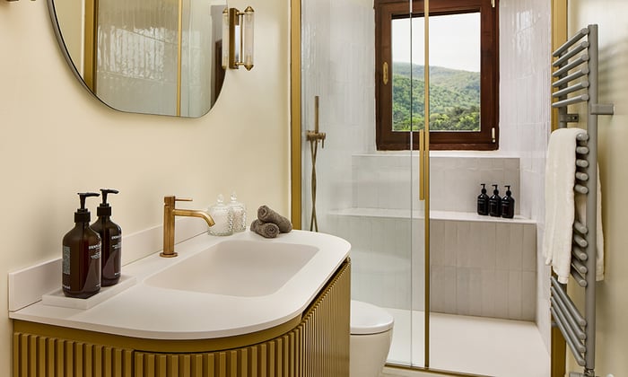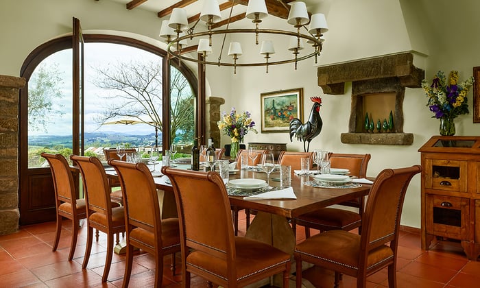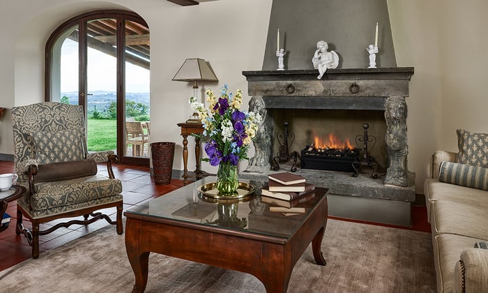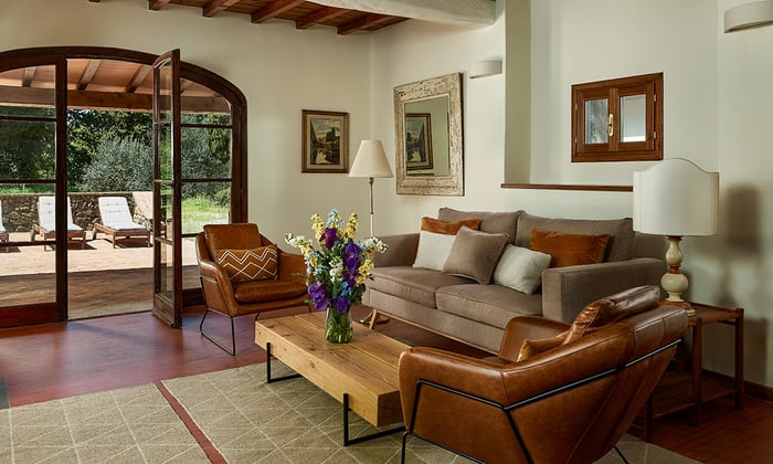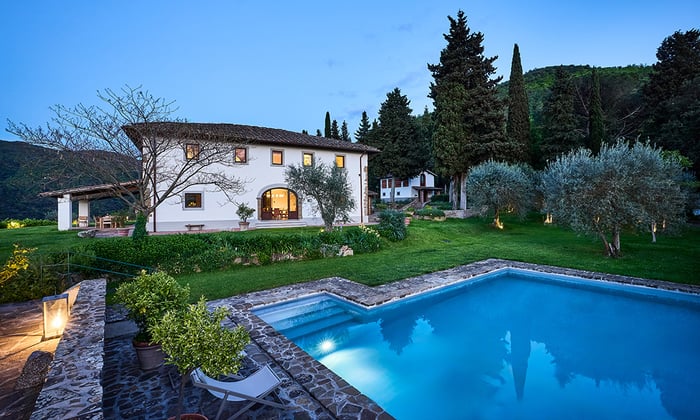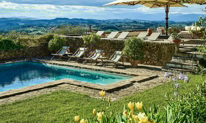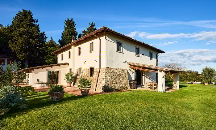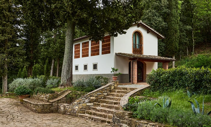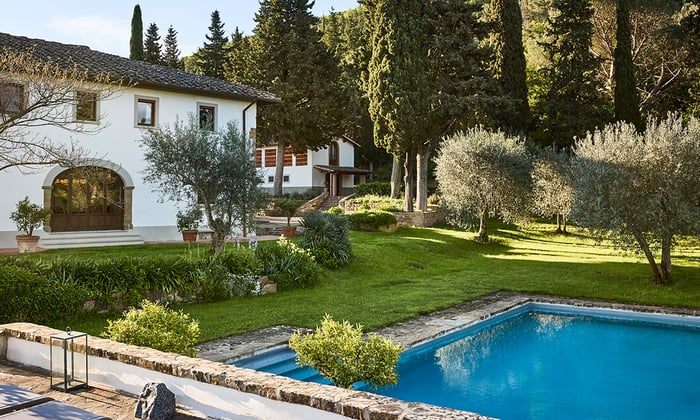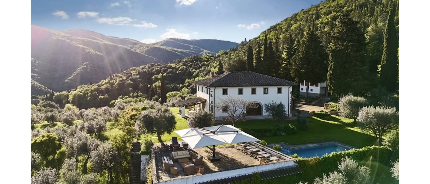 Set on over nine beautifully landscaped acres in the heart of the Florentine countryside, this luxurious private property features two renovated homes - the main villa and a separate guesthouse - as well as a six-car garage, lush gardens, shade trees, and olive groves. Centered around a stunning courtyard with outdoor terraces and a private pool, the estate's light-filled homes offer a total of six bedrooms and several spacious living areas, comfortably accommodating up to 12 guests.